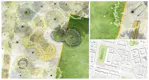 Kleine ‘Verrücktheiten‘, die Follies, stimulieren den Baumsalon. Dabei handelt es sich um Objekte, die in ihrer Form oder Funktion so eigenwillig und interessant sind, dass sie zum Spielen, Ausruhen, Kommunizieren, Bewegen, Turnen und individuellen Aneignen begeistern. Typische Gartenbänke werden in die Länge gezogen oder umrunden die Bäume, der Kiosk erhält seine eigenwillige Form aus der Zusammensetzung von Trafo, Sportgeräteunterstand und einem nachbarschaftlich organisierten Café und selbst die Schinkelleuchte wird in ihrer Anordnung zu einer kleinen ‘Verrücktheit‘. Die Formen der Spielorte legen sich um die Baumstandorte und fordern schon auf Grund der Kontur zum Spielen auf. Die Inhalte der Spielorte werden gemeinsam mit den Kindern der Nachbarschaft und der Grundschule entwickelt. Angedacht ist ein Spielen in und mit den Bäumen: Auf dem alten Glockengerüst geht‘s hoch hinaus in die Baumkronen, Sandspiele finden im lichten Schatten der Gehölze statt und die bestehende Klettermauer windet sich nun als Boulderwand um die Bäume. Selbstverständlich bietet das Arboretum auch didaktische Aspekte, indem Kinder und Erwachsene die unterschiedlichsten Blüten und Blätter kennenlernen können.