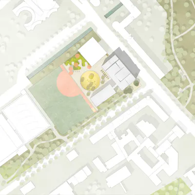 Mit einer kraftvollen Setzung an der Chausseestraße und Boyenstraße tritt das kombinierte Schul- und Sporthallenhaus in den Stadtraum. Die 3-geschossig organisierten Unterrichts- und allgemeinen Räume nehmen dabei klar ablesbar die Höhe des benachbarten Modularbaus in einer regelmäßigen großmaßstäblichen Lochfassade auf. Darüber liegt die Sporthalle, die sich über einen Materialwechsel und die stark modellierte Dachgeometrie markant absetzt. Als doppelthoher Einschnitt an der stadträumlichen Ecke ausgeildet, bleiben keine Zweifel am Hauptzugang zum Schulhaus.