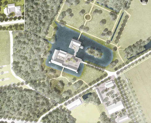 Der Zugang zur Burg erfolgt klar geführt über die ergänzte Allee, begleitet vom Baumüberstellten, grün anmutenden Parkplatz. Die Wirtschaftsgebäude werden um zwei Höfe gruppiert, die mit lockeren Baumgruppen stimmungsvolle Räume bieten. Der neue Pavillon mit konstruktiver Anlehnung an die Neue Ökonomie ist so platziert, dass zum einen der Hof eine gute Fassung erhält, zum anderen der Blick zur Burg teilweise erlebbar ist.