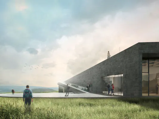 Der Baukörper des Neubaus - ein kreisrundes Gebilde - mit einer geschickten Eingangssituation in Form von Treppen und Rampen, die bis auf das Dach führen, sind für den Besucher ein Erlebnis, da von jedem Standort der Blick in die Weite der Rhön-Landschaft führt. Das Erlebnis auf der Dachterrasse ist für alle ein besonderes Highlight, und das nicht nur zu den offiziellen Öffnungszeiten, sondern rund um die Uhr - und das ganzjährig.