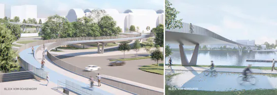 Die getrennten Fuß- und Radwege der neuen Gneisenaubrücke werden tangential fortgeführt. Auch der Radweg zum Bahnhof schließt schleifend an. Entlang einer behindertengerechten Rampe erreicht die Gradiente die notwendige Höhe um das Lichtraumprofil des Schwarzen Wegs sowie der B37 zu überschreiten.