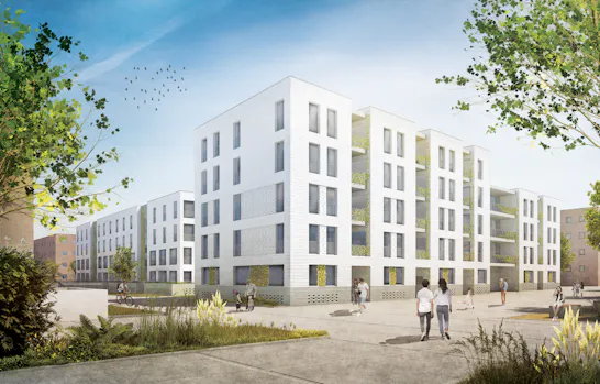 Die Verfasser konzentrieren sich auf die Reduktion als Entwurfsthema. Entsprechend stringent sind das Äußere und Innere der Gebäude angelegt. Nach außen hin wird ein flacher Klinkersockel in Brüstungshöhe ausgebildet, der sich etwas abgedunkelt unter dem hellen, ebenfalls geklinkerten Gebäude befindet. Allerdings wird durch die geringe Sockelhöhe das Gebäude optisch erhöht, was durch die vertikale Fugenausbildung in Eingängen und Loggien noch verstärkt wird. Diese Gliederung gibt dem Gebäude eine ablesbare Körnung und lässt eine gute Orientierung und Auffindbarkeit der Eingänge erhoffen. Die in den Fugen geplante Fassadenbegrünung wird auf Grund der nicht vorhandenen Bodengebundenheit nur schwer qualitativ hochwertig umzusetzen sein. Die offenen Brüstungen an den Loggien werden kritisch gesehen. Die sehr zurückhaltende und unaufgeregte Fassade ist schlüssig, bildet aber nicht die erhoffte prägnante Aussage zum Quartiersplatz hin und wird der besonderen Position im Areal nicht gerecht.