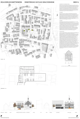 Brackenheim kann sich glücklich schätzen einen weitgehend historischen Stadtkern zu besitzen. Zahlreiche sehenswerte Fachwerkhäuser prägen die Umgebung des Rathauses. Das Rathaus selbst nimmt sowohl in Größe und Materialität eine Sonderstellung ein. Das bestehende Rathaus muß die städtebauliche Dominante bleiben. Die Eweiterung muß sich daher in Größe, Höhenentwicklung und Ausformulierung tendenziell eher an den Fachwerkhäusern als am Rathaus selbst orientieren. Das Bauvolumen wird daher auf zwei Baukörper aufgeteilt. Der eine fasst die Kirchgasse, der andere bildet an der Schellinggasse eine eigene Adresse für die Polizeistation. Die Untere Kirchgasse kann dann als zweiter öffentlicher Weg von der Kirche bis zur Marktstraße durchgeführt werden (ein evtl. vorgesehener Erweiterungsbau der Diakonie sollte im Anschluß zum Bestand im EG ausgespart werden). Die beiden neuen Häuser fügen sich selbstverständlich in den für das Ortsbild typischen Wechsel zwischen giebel- und traufständigen Satteldachhäusern ein. \"Star\" im Ensemble bleibt aber der beieindruckende, bestehende Rathausbau.