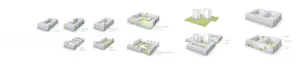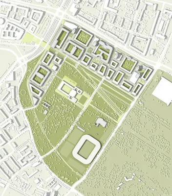 Der Bestand ordnet sich selbstverständlich in die neue bauliche Struktur ein. Das Quartier an der Zinzendorfstraße bedarf einer weiteren Qualifizierung, um nicht losgelöst als Insel zu fungieren. Die vorgeschlagene Sockelbebauung der Hochhäuser birgt das Potenzial einer Nutzungsintensivierung und einer Optimierung der städtebaulichen Integration des Bestands, bedarf jedoch des Nachweises einer Machbarkeit unter Berücksichtigung der baulichen Prämissen der Wohnhochhäuser.