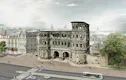 Ausgehend von der tiefliegenden Situierung des Stadttores und inspiriert von der Qualität historischer Platzsituationen schlagen wir eine schalenförmige Gliederung des Raumes vor, an dessen Tiefpunkt die Portra Nigra frei jeglicher Störung präsentiert wird. Das Denkmal wird ideell als wertvolles Objekt in einer Schale verstanden und so auch verständlich räumlich übersetzt. Gleichzeitig wird eine stadträumliche Situation geschaffen, die das öffentliche Leben an der Porta Nigra inszeniert und zusammenführt. Langezogene, flache Stufen aus Porphyr an der nördlichen Platzseite klären den dortigen Höhenunterschied zur Nordallee und inszenieren ein Hinabsteigen zur Porta Nigra.
