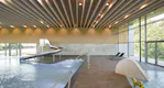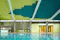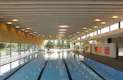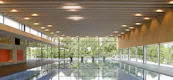 Während Keller- und Erdgeschoss in Stahlbeton (Sichtbeton) ausgeführt sind, konnte die Tragstruktur für die weit gespannte Badehalle und den Umkleidebereich in Holzbauweise errichtet werden. Auch die abgehängten, akustisch wirksamen Lamellen-Decken und Wandverkleidungen sowie die gelochte Seekieferdecke im Umkleidetrakt sind in Holz ausgeführt. Holz bietet ein gesundes Raumklima, ist CO2-neutral und recyclingfähig und eignet sich hervorragend, um Räumen mit schallharten Flächen, wie Badehallen, Atmosphäre zu verleihen und die Raumakustik zu optimieren. Darüber hinaus sorgte der hohe Vorfertigungsgrad der Holzelemente für eine wirtschaftliche Bauweise und kürzere Bauzeiten. So wurde die Holzrippendecke elementweise im Werk des Holzbauunternehmens Müller Blaustein vorgefertigt – inklusive Dachentwässerung, Beleuchtung, Ela-Anlage und abgehängter Lamellen-Decke aus heimischer Weißtanne. Diese Paneele zwischen den Holzrippen der Decke und an der Wand prägen maßgeblich die Innenraumwirkung des Stutenseebades. Dabei ist die Lamellenstruktur nicht nur gestalterisches Element, sondern optimiert zugleich die Raumakustik. Im Umkleide- und Eingangsbereich ist die tiefer liegende Holzrippendecke mit einer gelochten, weiß lasierten Akustikdecke aus Seekieferplatten verkleidet. Neben Holzdecke und Glasfassaden verleihen Sichtbeton, anthrazitfarbenes Feinsteinzeug, farbige Mosaikfliesen und farbig gestaltete Glasspinde dem Innenraum eine freundliche und warme Atmosphäre. Die ruhigen Materialien und frischen Farben sind bis ins Detail und fein aufeinander abgestimmt, so entsteht einerseits eine unverwechselbare und eigenständige Wirkung im Bad, die zugleich unaufgeregt natürlich anmutet. Damit punktet das Bad nicht nur unter ökologischen und ökonomischen Gesichtspunkten. Es überzeugt auch durch seine hohe Gestaltungsqualität unter soziokulturellem Blickwinkel – optimale Voraussetzungen also für den langfristigen Werterhalt des Gebäudes.